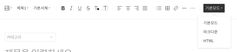 글쓰기에서 우측 상단에 기본모드가 디폴트로 적용되어 있고, 기본모드를 누르면 총 3가지 모드가 보여집니다.