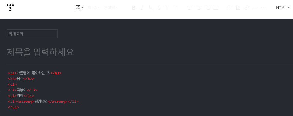 ⬇️ 위 내용을 HTML로 변환했을 때 예시: 부호는 제거되고 문장의 시작과 끝에 HTML태그가 생성됩니다.