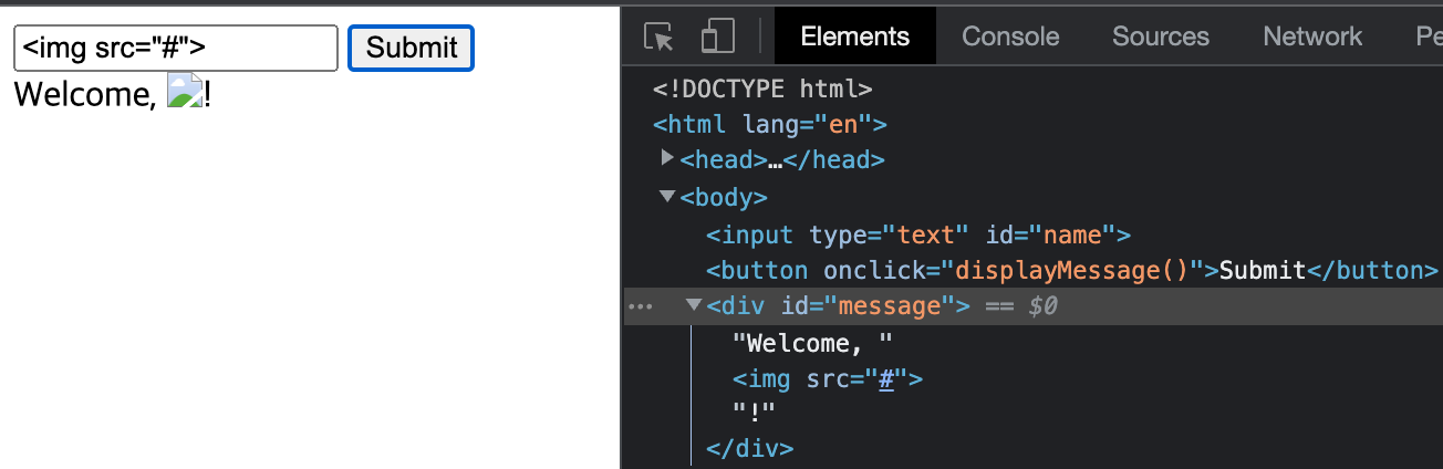 document.getElementById('message').innerHTML = 'Welcome, ' + name + '!';